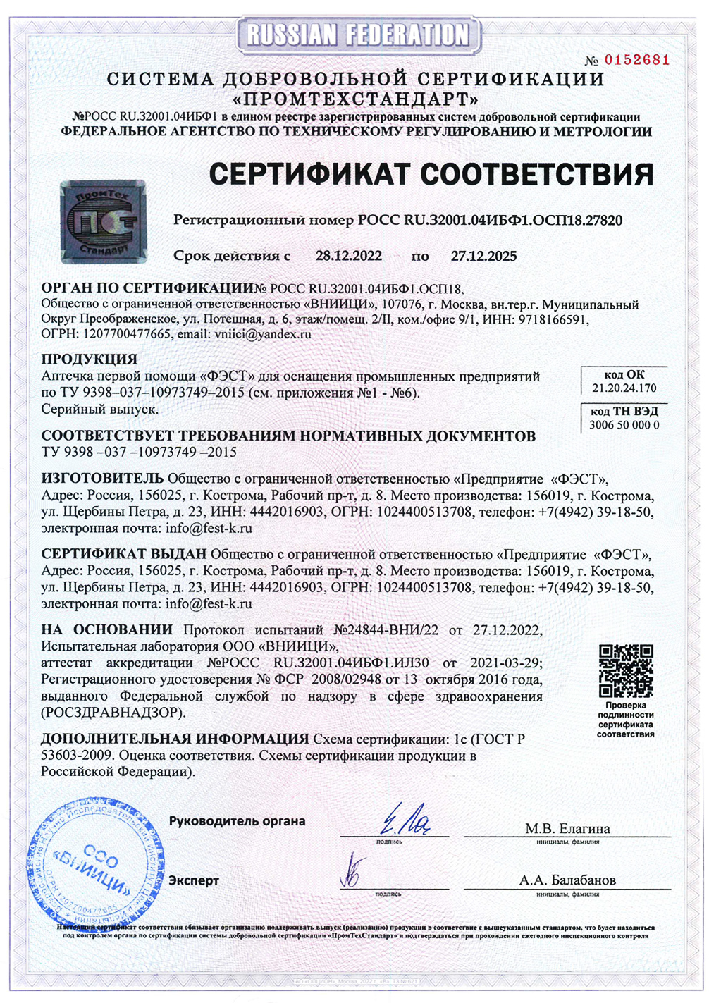 Аптечка первой помощи "ФЭСТ" предназначена для оснащения промышленных предприятий и рассчитана на оказание первой помощи коллективу до 30 человек. Комплектация соответствует номеру 7.3. Все медицинские изделия и препараты размещены в удобном и прочном настенном металлическом шкафу белого цвета с замком. Это обеспечивает сохранность содержимого, защиту от несанкционированного доступа, пыли и влаги, а также быстрый и удобный доступ к средствам для оказания помощи. Аптечка необходима для обработки ран, остановки кровотечений, помощи при болях, стрессах, отравлениях и обострении хронических заболеваний до приезда медиков.