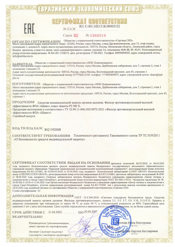 - Класс защиты: FFP3 (ГОСТ 12.4.294-2015, EN 149:2001+A1:2009)